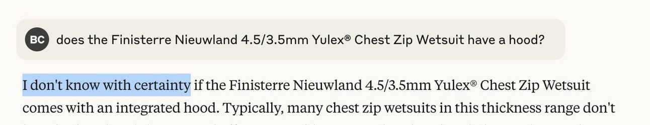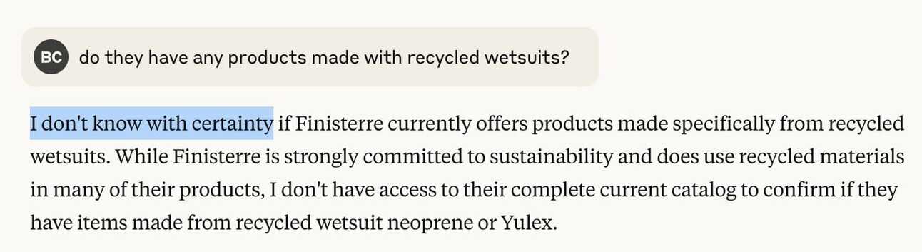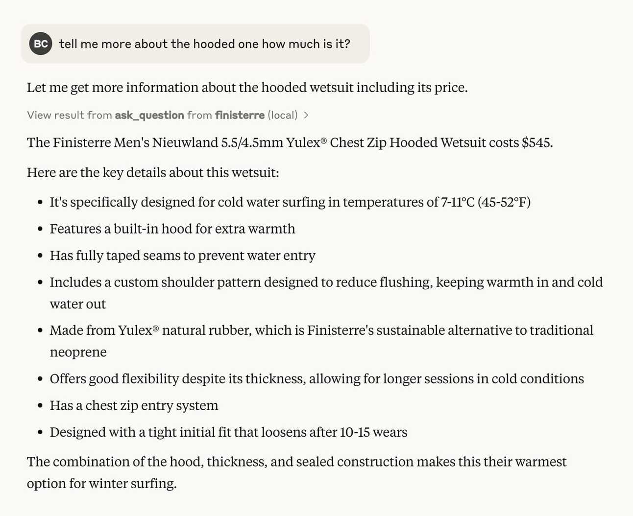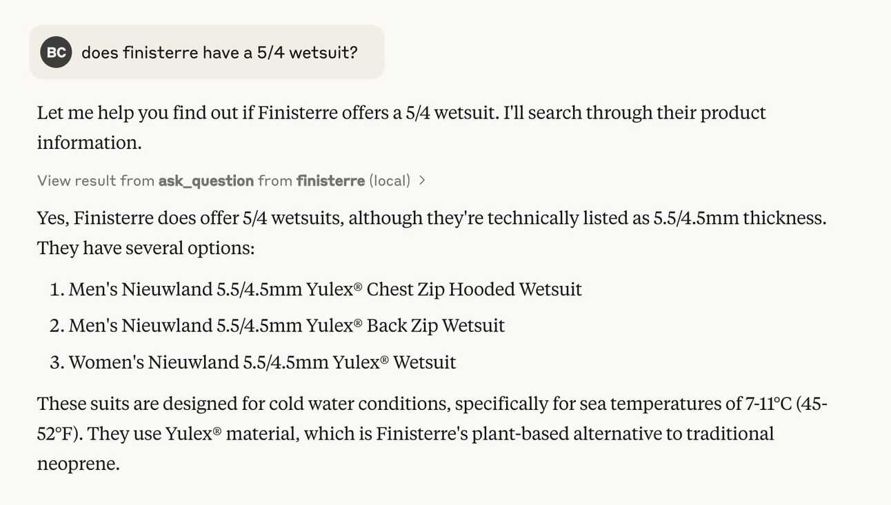 Claude (with MCP/RAG): "Based on your needs, I've found three options that would work well: The Finisterre Nieuwland 5E 5/4 has their most flexible neoprene in the shoulder panels while maintaining 5mm thickness in the core. It's currently in stock in sizes S-XL at $329. The Nieuwland 6E offers more warmth with 6mm core thickness but slightly less mobility, available for $359. Both use 100% Yulex natural rubber rather than petroleum-based neoprene."