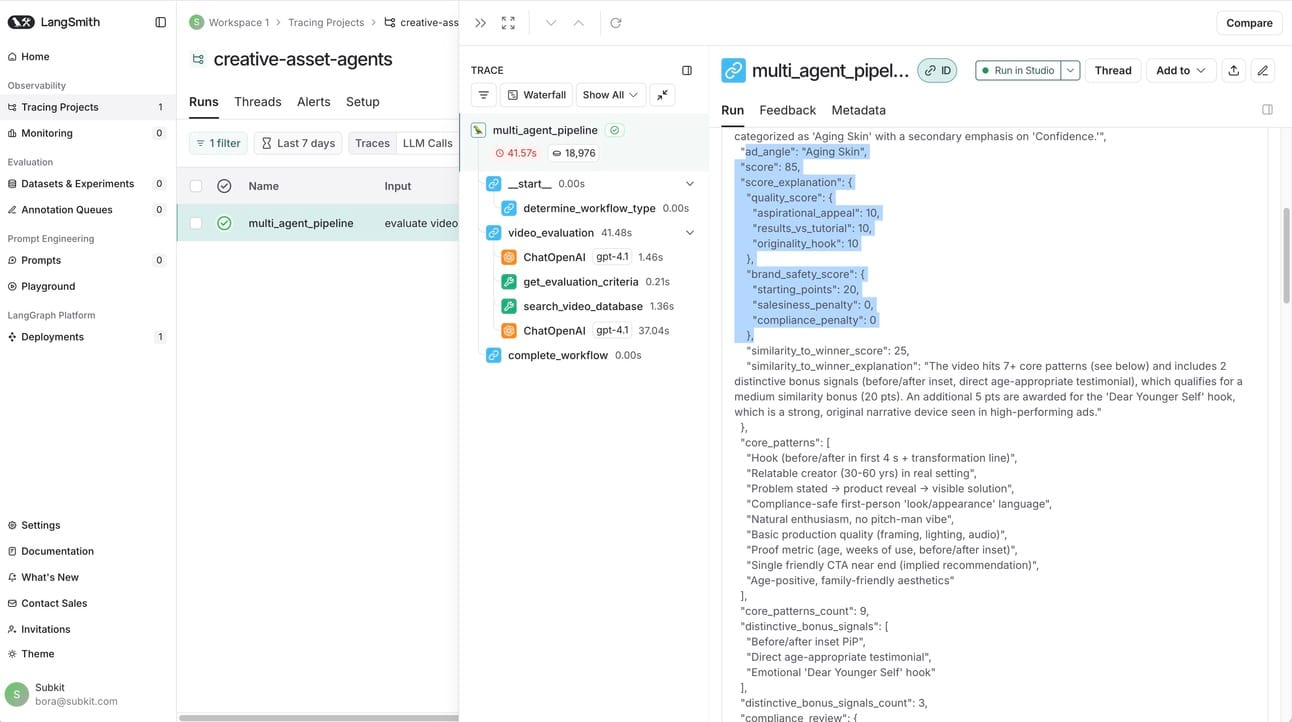 LangSmith's tracing capabilities let us track every decision the AI makes. When the system scored a video differently than our expert reviewers, we could trace exactly which pattern recognition failed and retrain that specific component.