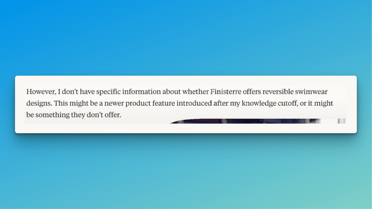 Currently, platforms like ChatGPT rely heavily on crawling web pages. But product updates, like Finisterre’s newest swimwear collection (as I demo’d in my agentic commerce video), often don't appear immediately because crawlers haven't reindexed recently updated pages. The latest crawl for Finisterre might be months old, leaving shoppers unaware of new releases.